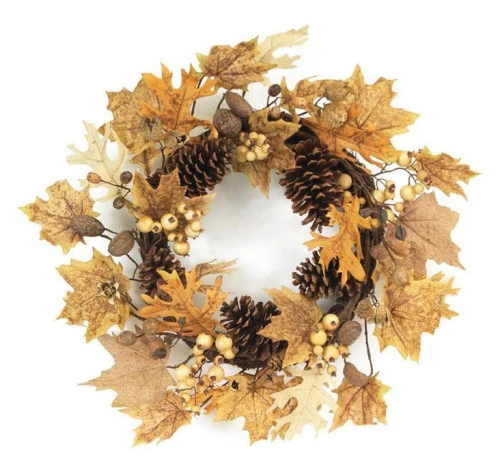 Accented with a solid twig base, pine cones, and sprawling autumn leaf