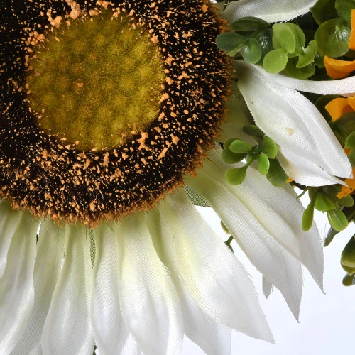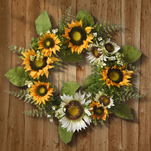 Wreath features yellow and white sunflower blooms in assorted sizes
